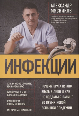 автор — Александр Мясников, изд. Эксмо, 304 стр. (мягкая обложка).      В мире появляются новые инфекции. А все новое, как известно, пугает. Как защитить себя, своих детей и родных? Какие меры нужно предпринимать для профилактики и лечения? Как не потратить деньги впустую, обогатив фармкомпании? Как не поддаться панике? В новом, дополненном издании книги «Инфекции» доктор Мясников подробно рассказывает о том, что нам необходимо знать об инфекциях. От самых страшных и новых до, казалось бы, давно известных.