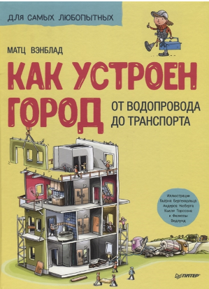 автор — Матц Вэнблад, изд. Питер, 92 стр.    Откуда в моём доме вода? Как люди общались до появления почты, телефонов и Интернета? Чем посыпают дороги, чтобы они не были скользкими? Как в моём доме загораются лампочки? Мы живём в огромных городах, где можно запросто заблудиться. Эта книга о том, как устроен город и наш дом в нём. Мы расскажем и покажем, как еду хранили до появления холодильников, из чего состоит асфальт на дорогах и как разобраться в автобусном расписании. Ты побываешь на городской теплоцентрали, узнаешь, как консервировать еду, посмотришь, как в доме работает отопление, водопровод и электричество. Тебя ждут красочные и детализированные картинки с изображением всех мелочей. Давай отправимся в увлекательное путешествие по твоему городу и дому — и ты удивишься, как много любопытного вокруг!