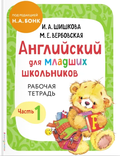 авторы — Маргарита Вербовская, Ирина Шишкова, изд. Эксмо, 128 стр.  (мягкая обложка).          Зачем нужна рабочая тетрадь? Чтобы хорошенько потренироваться, применяя новые знания на практике! Рабочая тетрадь к книге «Английский для младших школьников. Часть 1» – это отличная возможность попрактиковаться в выборе, чтении и написании букв, слов, звуков, знаков транскрипции и фраз, освоенных в книге! Именно так, с практикой, знание превращается в умение – то есть в навык. Выполняя веселые задания – «обведи», «найди», «соедини», «раскрась», – дети учатся читать и писать по-английски, безошибочно узнавать английские буквы и знаки транскрипции, правильно строить простые фразы. Эффективность авторской методики проверена десятками тысяч ребят, изучающих английский по «Английскому для младших школьников». По какому бы учебнику ни занимался ребенок в школе, «Английский для младших школьников» даст ему знания и навыки, которые помогут на уроках английского! Веселых занятий и отличных оценок!