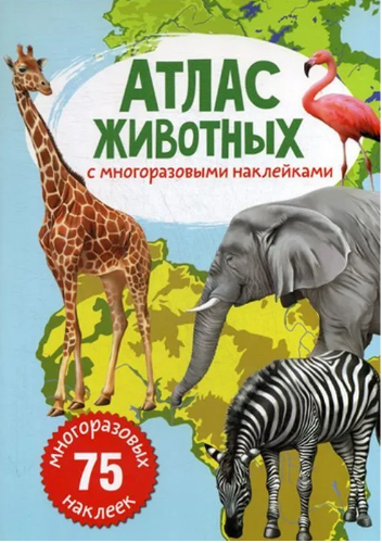 Открыв этот атлас, вы отправитесь в кругосветное путешествие, во время которого познакомитесь со 178 видами животных и узнаете, где они обитают. Рассматривайте красочные иллюстрации, находите зверей, рыб и птиц, которых не хватает на рисунках. Дополняйте картинки многоразовыми наклейками, используя в качестве подсказки полупрозрачные изображения животных.