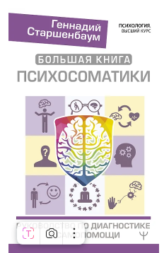 автор — Геннадий Старшенбаум, изд. АСТ, 416 стр. Известный врач-психотерапевт Г. В. Старшенбаум долгое время изучает вопросы, связанные с психосоматическими расстройствами. Результатом многолетнего труда автора стала эта «Большая книга», призванная помочь как врачам и психологам, так и всем, кто заинтересован в улучшении самочувствия и повышении качества жизни.