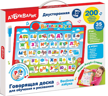 изд. Азбукварик, серия — Говорящая доска.  (Двусторонняя).      Первая сторона – «Нажимай и учись». Здесь расположены говорящие картинки с буквами и обучающие режимы. Малыш будет слушать и учить алфавит, слова, стихи и забавные звуки. Чтобы учиться было интереснее, доска сыграет весёлые песенки («Песенка про алфавит», «Если весело живётся, делай так», «Чунга-чанга», «Стало солнышко теплей», «Антошка», «Пляшут весело детишки», «Наши друзья») и 3 любимые сказки («Заюшкина избушка», «Три медведя», «Пузырь, соломинка и лапоть»).