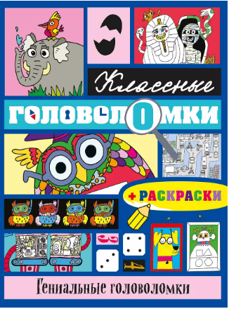 изд. Эксмо, серия — Классные головоломки, 88 стр.  (мягкая обложка).      «Гениальные головоломки (+ раскраски)» .Тебе нет равных, когда дело доходит до игр и веселья? У тебя талант раскрашивать картинки? Проверь свои способности — брось вызов классным заданиям в этой весёлой книге! .