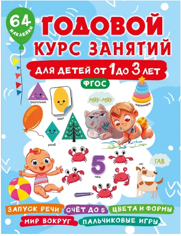 автор — Валентина Дмитриева, изд. Сова (Малыш), 128 стр. (мягкая обложка). «Годовой курс занятий для детей от 1 до 3 лет. 64 наклейки» — это развивающее пособие для запуска речи, развития внимания, памяти, мелкой моторики, координации движений и логического мышления. Все необходимое для развития и обучения ребенка от года до трёх лет собрано в этой книге: кроха сделает первые шаги в познании окружающего мира, будет понимать обращенную к нему речь, с удовольствием рассматривать на картинках домашних и диких животных, потренирует пальчики, сможет узнавать и называть цвета и геометрические формы, освоит счёт до пяти, познакомится с потешками, пестушками и сказками, выучит 300 новых слов и научится строить фразы. Это идеальная книга-обучалка для самых маленьких: 64 красочные наклейки, много интересных игр и заданий, цветные картинки — и ни одной скучной страницы!