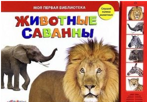 изд. Белфакс, серия — Моя первая библиотека, 12 стр. Эта красочная и познавательная книга расскажет ребенку об обитателях саванны: льве и слоне, зебре и жирафе, бегемоте и гепарде. А еще малыш сможет нажимать на кнопочки и слушать настоящие голоса животных!
