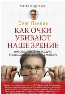 автор — Олег Панков, изд. АСТ, 288 стр. «Все «очкарики» — хронические больные, страдающие самыми разными недугами, а не только заболеваниями глаз» — убежден автор этой книги профессор-офтальмолог Олег Павлович Панков. Причина в том, что организм этих людей хронически недополучает ультрафиолет. Ведь только 20% ультрафиолета человек получает через кожу, основные же 80% воспринимаются через глаза. А глаза «очкариков» все время закрыты от солнца линзами. Кроме того больные глаза просто не в состоянии воспринимать ультрафиолет в необходимых количествах.