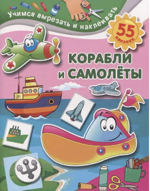 изд. АСТ, 16 стр.  (мягкая обложка).      На страницах развивающей книжки «Корабли и самолёты» малышей ждёт множество летающих и плавающих транспортных средств, а ещё 55 красочных стикеров для наклеивания. Выполняя увлекательные задания, ребёнок будет вырезать и наклеивать картинки, дополнять страницы наклейками. Упражнения помогут ребятам научиться правильно и безопасно пользоваться ножницами, а заодно развить мелкие движения кистей рук, интеллект и внимание.