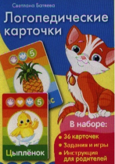 автор — Светлана Батяева, изд. Росмэн, 36 карточек.   Звуки (С, З, Ц, Л). Логопедические карточки. Для детей от трех лет