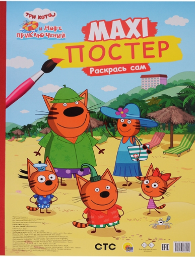 Премьера сезона! Представляем новую MAXI-раскраску с сюжетами из полнометражного фильма «Три кота и море приключений»: окунись в лето вместе с Компотом, Коржиком и Карамелькой! Размер имеет значение, ведь самым юным художникам проще раскрашивать крупные элементы. Кроме того, благодаря твердой основе удобно творить даже на полу, а еще, чтобы картину легко было вырвать, а после украсить ею комнату или подарить, у основания листа предусмотрена перфорация.