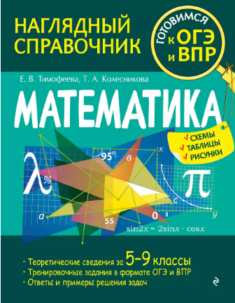 авторы — Татьяна Колесникова, Елена Тимофеева, изд. Эксмо, 144 стр.  (мягкая обложка).      Наглядный справочник по математике для подготовки к ОГЭ и ВПР станет незаменимым помощником для учеников средних к