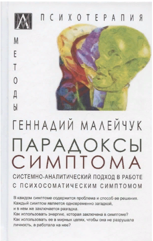 автор — Геннадий Малейчук, изд. Альма-матер, 248 стр.      Диагностика и терапия проблем психосоматического характера предполагает обращение к идее единства психического и соматического. Еще одной важной установкой в диагностике психосоматических проблем является поиск их причин, что предполагает глубокий анализ структуры личности клиента, его жизненного опыта и его истории жизни. Наиболее полно эти идеи отражает авторский системно-анали-тический подход в диагностике клиента, основанный на принципах системности, феноменологии и развития. Основным материалом для применения данного подхода является феномен симптома и отношения пациента к нему.