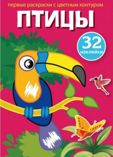 изд. Кристалл Бук, 8 стр.  (мягкая обложка).      С нашей книгой любой непоседа забудет о шалостях и проказах, ведь его ждёт интереснейшее занятие — раскрашивание картинок! Цветные контуры подскажут юному художнику, какую краску лучше выбрать, а яркие наклейки помогут сделать рисунок ещё красивее. Создавая свои маленькие шедевры, ребёнок заодно узнает, какие бывают птицы и как они выглядят.