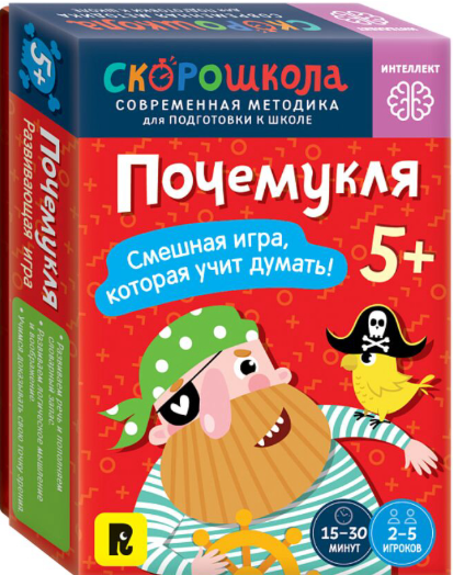 изд. Росмэн, серия — СкороШкола.                «Почемукля» – увлекательная игра, которая учит думать, находить взаимосвязь между предметами и обосновывать свое мнение. Помогая пиратам добывать сокровища, ребенок сможет пополнить словарный запас, развить логическое мышление и воображение, научиться доказывать свою точку зрения. Автор игры – Елена Молчанова – логопед, педагог, специалист по запуску речи и развитию слухового внимания. В наборе 96 карточек и четыре варианта игры для всей семьи.
