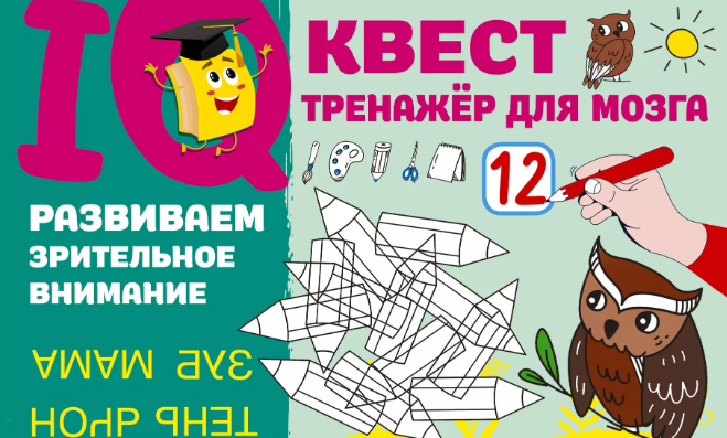 автор — Валентина Дмитриева, изд. Сова. Малыш, 64 стр. (мягкая обложка). «Развиваем зрительное внимание» — это замечательный IQ-тренажёр в форме квеста. Ребёнок научится находить «спрятанные» буквы и цифры, разгадывать шифр, обращать внимание на сходства и отличия, отделять главное от второстепенного, запоминать последовательность предметов, писать графические диктанты и многое другое.