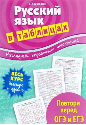 автор — Ирина Таровитая, изд. Эксмо, 32 стр.   (мягкая обложка).       Справочник содержит информативные таблицы за весь школьный курс русского языка (5-11 классы). Приводятся краткие сведения по всем темам, проверяемым на ОГЭ и ЕГЭ. Благодаря наглядности и доступности материала пособие обеспечивает эффективное повторение предмета при подготовке к урокам и экзаменам.