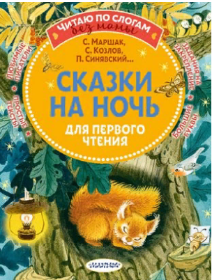 изд. Малыш, серия — Читаю без мамы по слогам, 78 стр. (мягкая обложка). В этой книге собраны сказки С. Маршака, П. Синявского, С. Козлова и других знаменитых отечественных авторов, подходящие для первого самостоятельного чтения. Простые и увлекательные игры с буквами и словами для тренировки техники чтения можно выполнять сидя в кроватке.