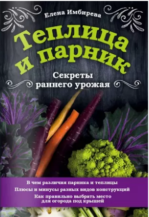 автор — Елена Имбирева, изд. Эксмо, 32 стр. (мягкая обложка). Эта книга — практическое руководство для тех, кто решил ускорить получение урожая и готовится начать новый сезон с оборудования парника или теплицы. В ней содержится вся необходимая информация: от выращивания в закрытом грунте с нуля до богатого урожая; о сходстве и различиях парников и теплиц; о выборе правильного места под теплицу; об укрывных и каркасных материалах и их совместимости друг с другом; о подготовке почвы и особенностях ухода за растениями в закрытом грунте.