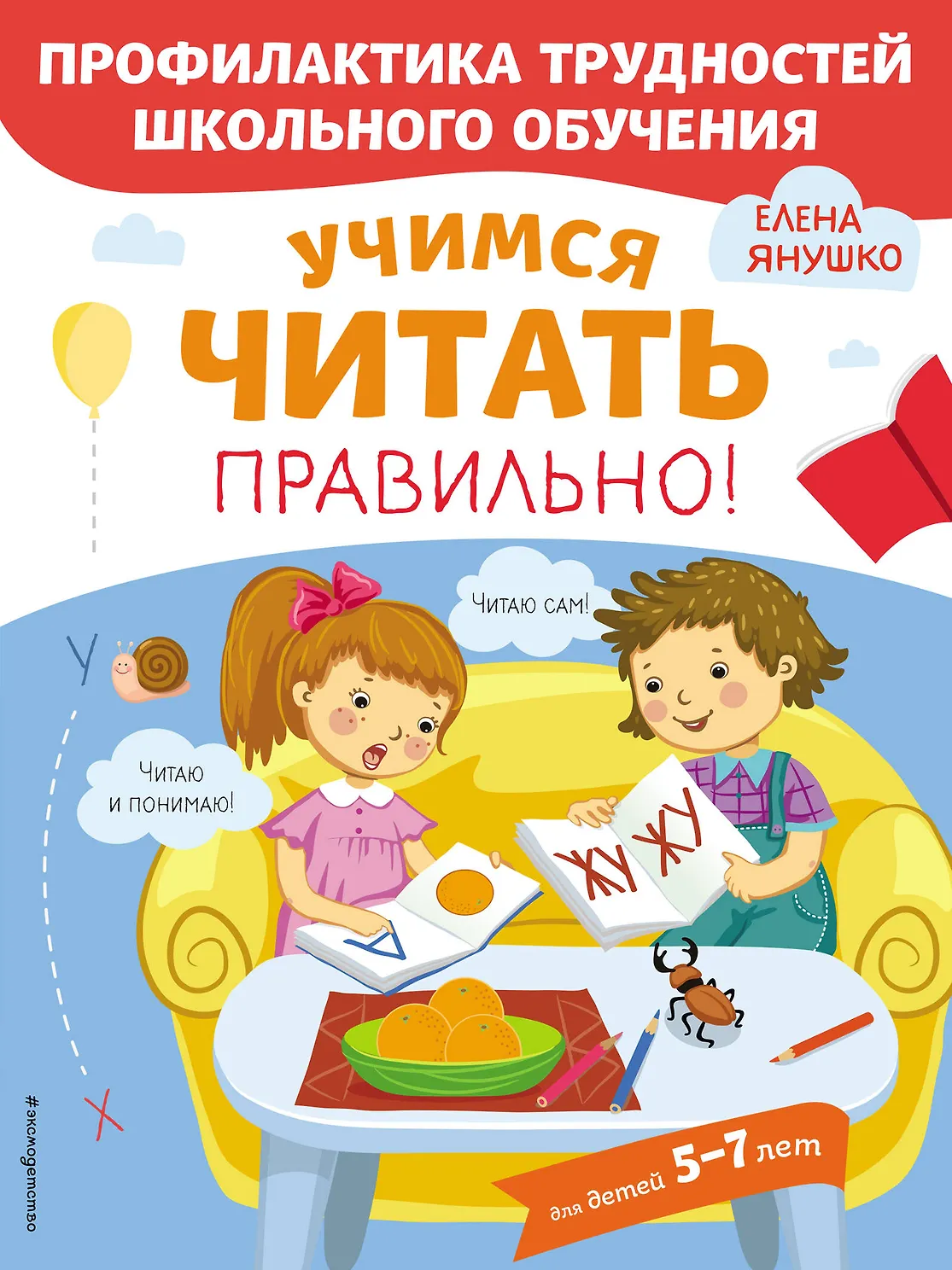 автор — Елена Янушко, изд. Эксмо, 72 стр. (мягкая обложка). «Читаю слитно» и «Читаю и понимаю» — вот девизы этого пособия, с помощью которого ваш ребёнок сможет поэтапно освоить навык чтения. Сначала он выучит звуки, которые обозначают буквы. А чтобы лучше их запомнить, в книге есть специально подобранные картинки — образы. Затем он перейдет к следующему этапу чтения — сливанию букв в слоги, начиная с обратных слогов (например, АМ, АП), так как гласные звуки тянуть легче. Далее ваш ребёнок будет учиться читать прямые слоги (например, МА, ПА) — для их отработки в пособии представлены таблицы слогов. После он отработает навык чтения простых и сложных слов и перейдет к чтению словосочетаний и предложений из двух-четырёх слов. Чтобы ребёнок понимал, что читает, в пособии даны увлекательные задания, которые помогут ему осознать прочитанный текст.