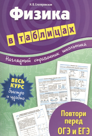 автор — Наталья Столяревская, изд. Эксмо-пресс, 32 стр. (мягкая обложка). Справочник содержит информативные таблицы за весь школьный курс физики (7-11 классы). Приводятся краткие сведения по всем темам, проверяемым на ОГЭ и ЕГЭ. Благодаря наглядности и доступности материала пособие обеспечивает эффективное повторение предмета при подготовке к урокам и экзаменам.