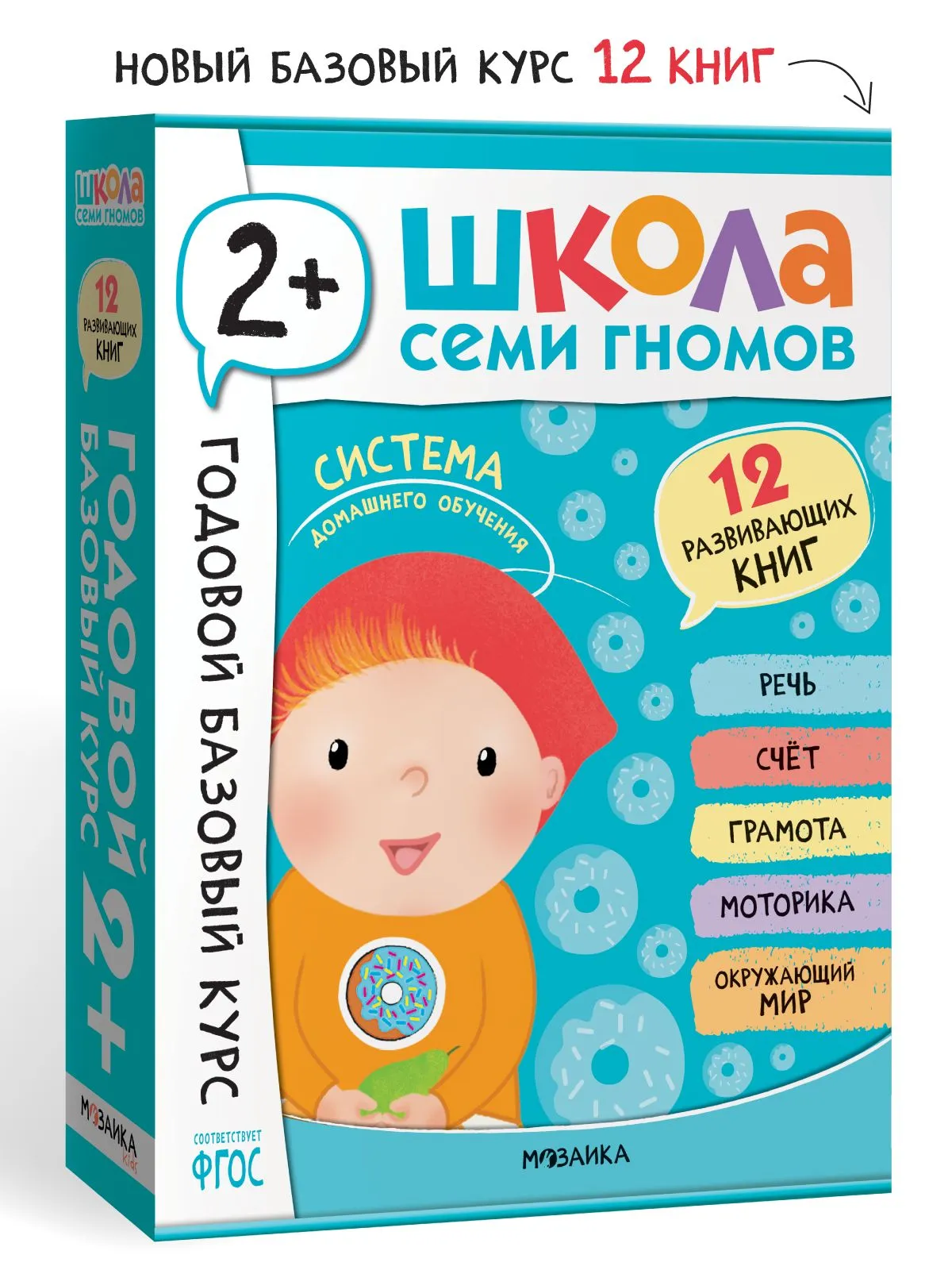Комплексная образовательная программа «Школа Семи Гномов. Базовый годовой курс 2+» представляет собой популярный занимательный набор из двенадцати развивающих книг, дополненный обучающим плакатом, увлекательной игрой и торжественным дипломом для маленького ученика. В состав комплекта входят такие важные направления развития как «Времена года», «Азбука для малышей», «Первый счёт», «Первый словарик», «Развитие мышления», «Мелкая моторика», а также книги об окружающем мире: «В деревне», «В лесу», «В зоопарке», «Транспорт», «Какие бывают профессии» и «Хорошо и плохо».